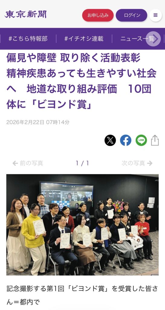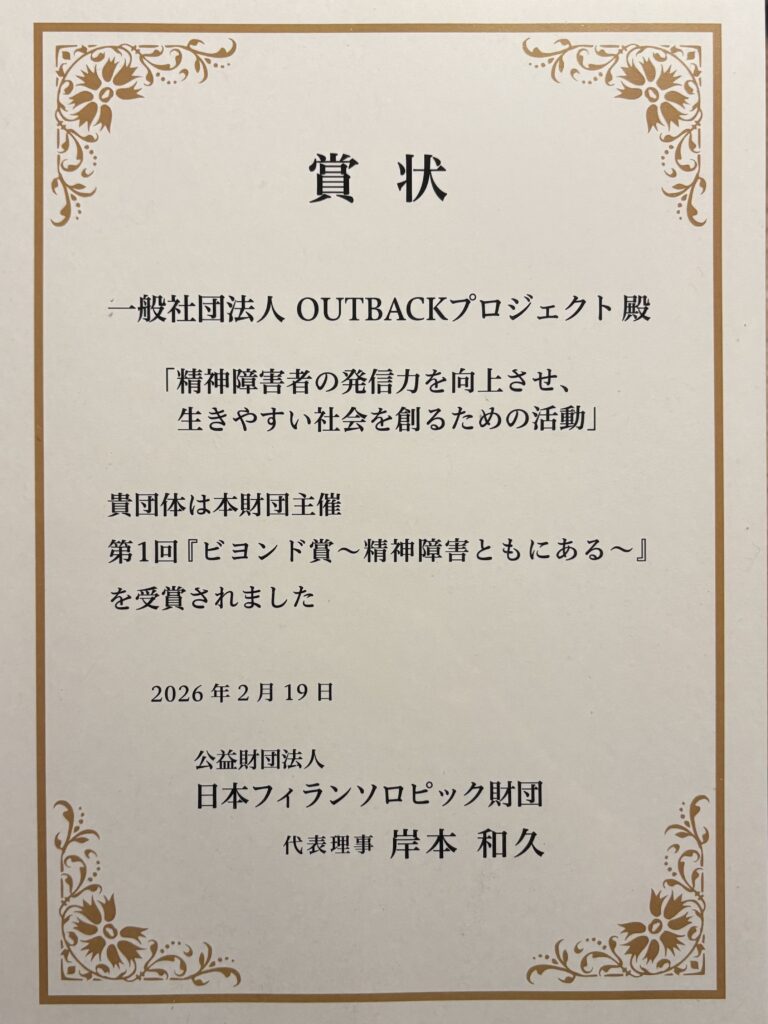 OUTBACKプロジェクトが取り組む「精神障害者の発信力を向上させ、生きやすい社会を創るための活動」が高く評価され、2026年2月、公益財団法人日本フィランソロピック財団の「第1回ビヨンド賞〜精神障害ともにある〜」を受賞しました。2月19日に東京で授賞式が行われ、OUTBACKプロジェクト代表の佐藤光展とOUTBACKアクターズスクール校長の中村マミコが参加しました。