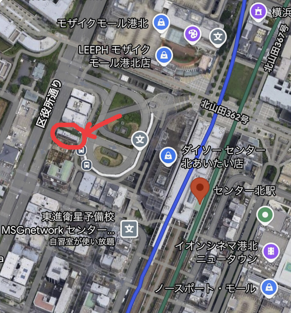 横浜市営地下鉄センター北駅の西側、バスロータリー沿いにあります(Googleマップ)