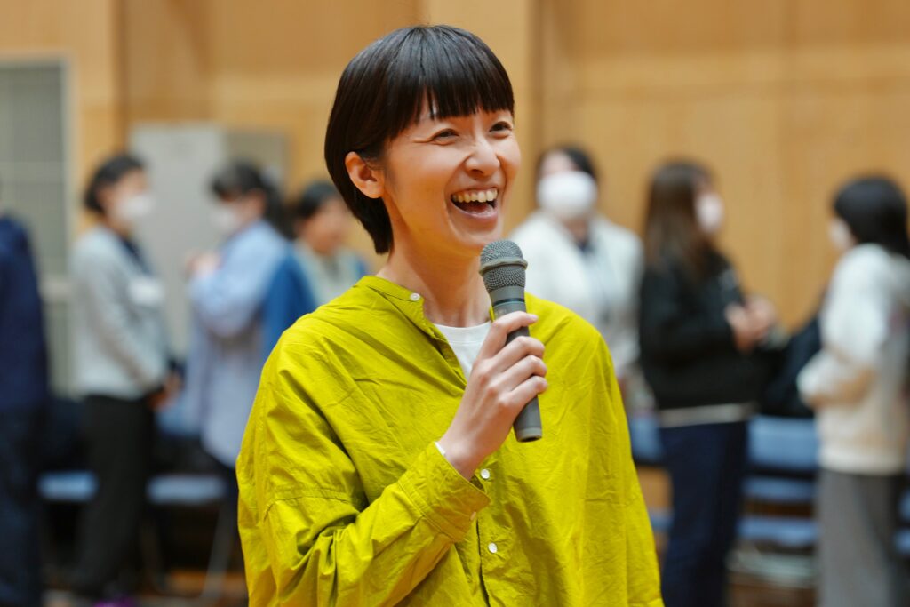 ワークショップの進行は、OUTBACKアクターズスクール校長の中村マミコが担当し、アシスタントとしてスクール生のゆゆ、くにくく、さっちゃん、サシくんが参加しました。新人職員たちは、互いの名前もよく知らない状況だったので、緊張が解けるように簡単なゲームから始めました。そして、体を使ってモノの形を表現するワークに移りました。